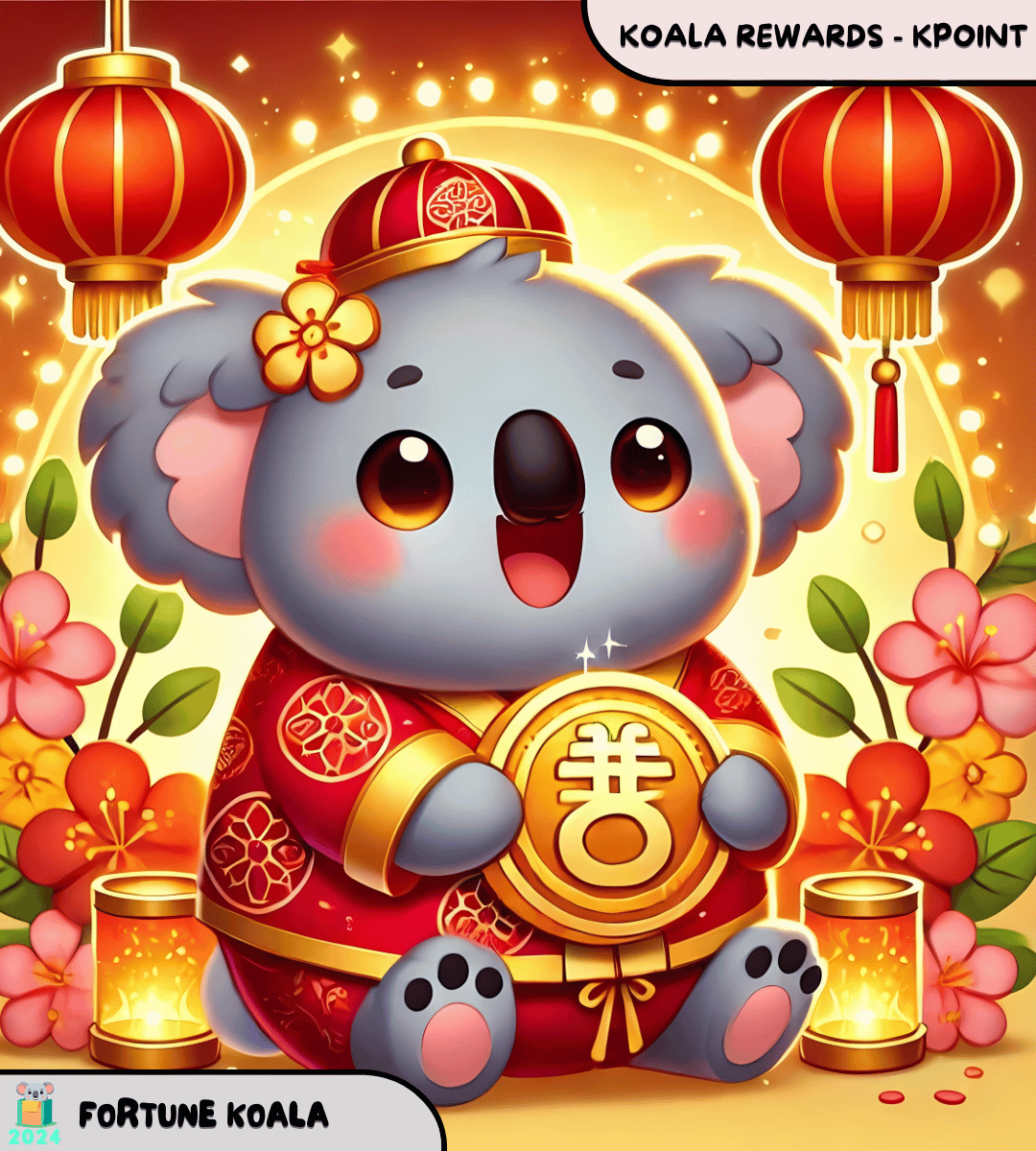 Fortune Koala is a joyful, chubby koala dressed in festive red and gold, holding a golden coin of prosperity. Surrounded by glowing lanterns and vibrant blossoms, he brings luck, happiness, and fortune to all.